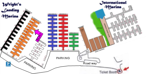 The Marina is broken up using color coding, as you can see in the picture below. Each set of docks is its own color, and we are on Orange dock. Then along with the color the slips are numbered. This is how you know where on that dock you slip your boat. We are in slip 35, and that's out toward the end of the orange dock.